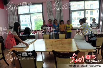 2014年6月8日,湖北省秭歸縣職業(yè)教育中心學(xué)生在實(shí)訓(xùn)基地進(jìn)行西餐擺臺(tái)訓(xùn)練。