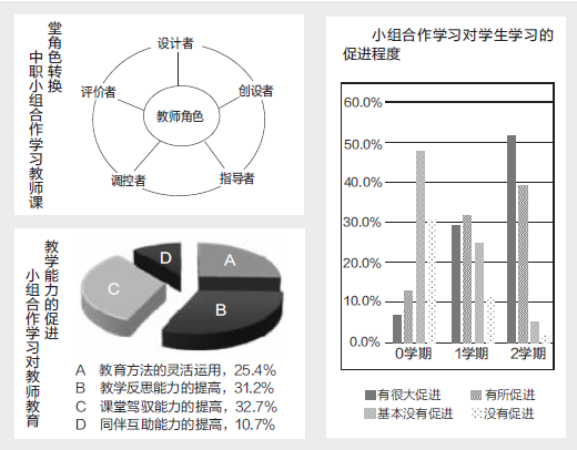 教師角色的成功轉(zhuǎn)型。傳統(tǒng)教學(xué)中,教師扮演“權(quán)威”、傳話者、控制者等角色,強調(diào)指令和服從,對學(xué)生單向灌輸知識,體現(xiàn)教師主導(dǎo)地位。湖州市中職小組合作學(xué)習(xí)中,一切以學(xué)生為中心,一切為了學(xué)生的學(xué)習(xí),教師轉(zhuǎn)變角色,在課堂上成為合作任務(wù)的設(shè)計者、合作情景的創(chuàng)設(shè)者、合作活動的指導(dǎo)者、合作過程的調(diào)控者、合作表現(xiàn)的評價者。