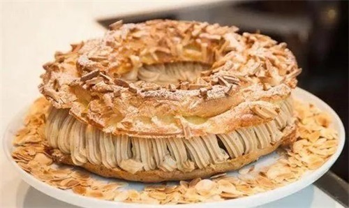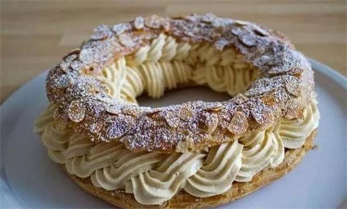 巴黎布雷斯特車輪泡芙是有名的法國糕點,外形似車輪狀,由嵌入摻以糖杏仁屑細奶油的泡芙,并撒滿杏仁碎而成。