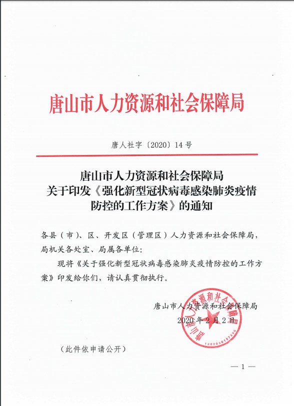 • 唐山市人社局關(guān)于印發(fā)《強(qiáng)化新型冠狀病毒感染的肺炎疫情防控的工作方案》的通知