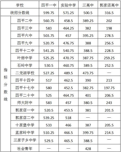 四平市第一高級中學599.75;四平市實驗中學571.25;四平市第三高級中學500.5;郭家店高級中學316.50。