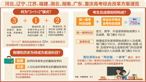 根據(jù)公布的實(shí)施方案,8省份的方案為“3+1+2”模式,即“3”為全國統(tǒng)考科目語文、數(shù)學(xué)、外語,所有學(xué)生必考;“1”為首選科目,考生須在高中學(xué)業(yè)水平考試的物理、歷史科目中選擇一科;“2”為再選科目,考生可在化學(xué)、生物學(xué)、思想政治、地理4個(gè)科目中選擇兩科。