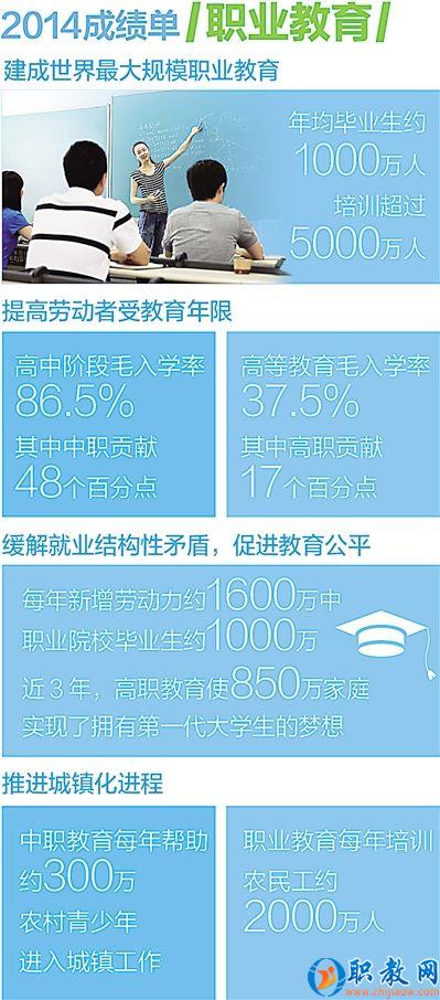 目前,中國特色現(xiàn)代職業(yè)教育發(fā)展道路初步形成,服務經(jīng)濟社會發(fā)展和人的全面發(fā)展的能力大幅提升。2014年,全國共有職業(yè)院校1.33萬所,年招生966.83萬人,在校生2809.53萬人?!笆濉币詠?,職業(yè)院校共培養(yǎng)近5000萬畢業(yè)生。近年來一些熱門行業(yè)新增從業(yè)人員中,職業(yè)院校畢業(yè)生占70%以上。