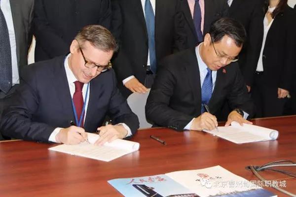 2017年3月21日,聯(lián)合國(guó)教科文組織與北京曹妃甸國(guó)際職教城在法國(guó)巴黎總部舉行簽約儀式,聯(lián)合國(guó)教科文組織戰(zhàn)略合作局局長(zhǎng)Jean-Yves Le Saux和北京曹妃甸國(guó)際職教城總經(jīng)理姚義純分別代表雙方簽字。聯(lián)合國(guó)教科文組織教育部門(mén)青年、掃盲與技能發(fā)展科科長(zhǎng)Borhene Chakroun,中國(guó)常駐聯(lián)合國(guó)教科文組織代表團(tuán)大使銜代表沈陽(yáng),中國(guó)聯(lián)合國(guó)教科文組織全委會(huì)秘書(shū)長(zhǎng)杜越,聯(lián)合國(guó)教科文組織政策和終身學(xué)習(xí)系統(tǒng)處處長(zhǎng)戴維?阿喬萊那(David Atchoarena),唐山市政府黨組副書(shū)記崔晗,市政府副秘書(shū)長(zhǎng)周景會(huì),市教育局副局長(zhǎng)張志國(guó),北京曹妃甸國(guó)際職教城副總經(jīng)理孫愛(ài)萍、總經(jīng)理助理?xiàng)钪橇芤煌鱿⒁?jiàn)證了簽約儀式。