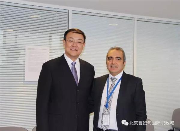 聯(lián)合國(guó)教科文組織教育部門(mén)青年、掃盲與技能發(fā)展科科長(zhǎng)Borhene Chakroun和唐山市政府黨組副書(shū)記崔晗合影