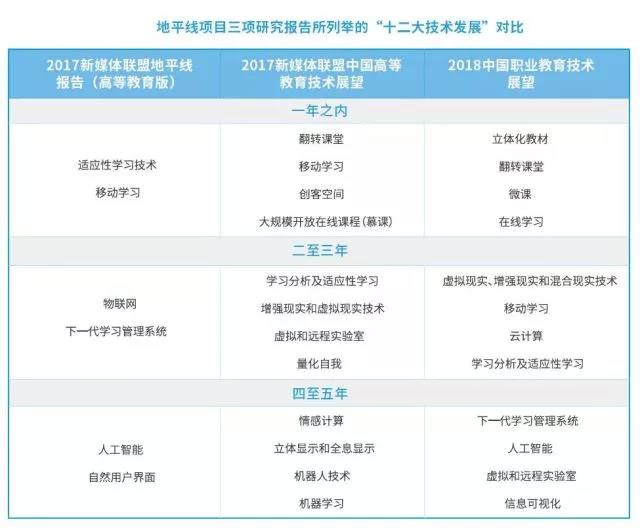 同時,報告按照未來“一年之內(nèi)”、未來“二至三年”以及未來“四至五年”三個不同的時間段,將這些對中國職業(yè)院校具有影響潛力的教育技術根據(jù)重要程度進行了歸類。
